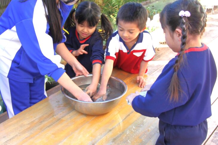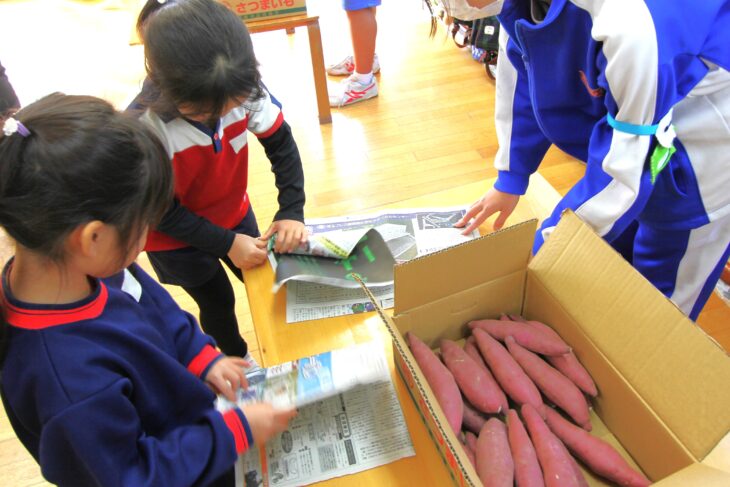 焼き芋大会の前日、年長さんがさつまいもを新聞紙で包み、塩水につけてアルミホイルを巻きました。