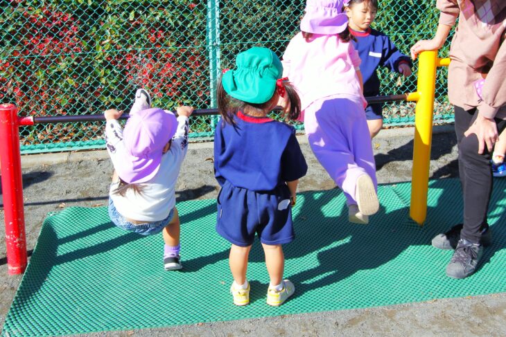 乳児さんも幼児さんも、みんな楽しそうに鉄棒で遊んでいます。